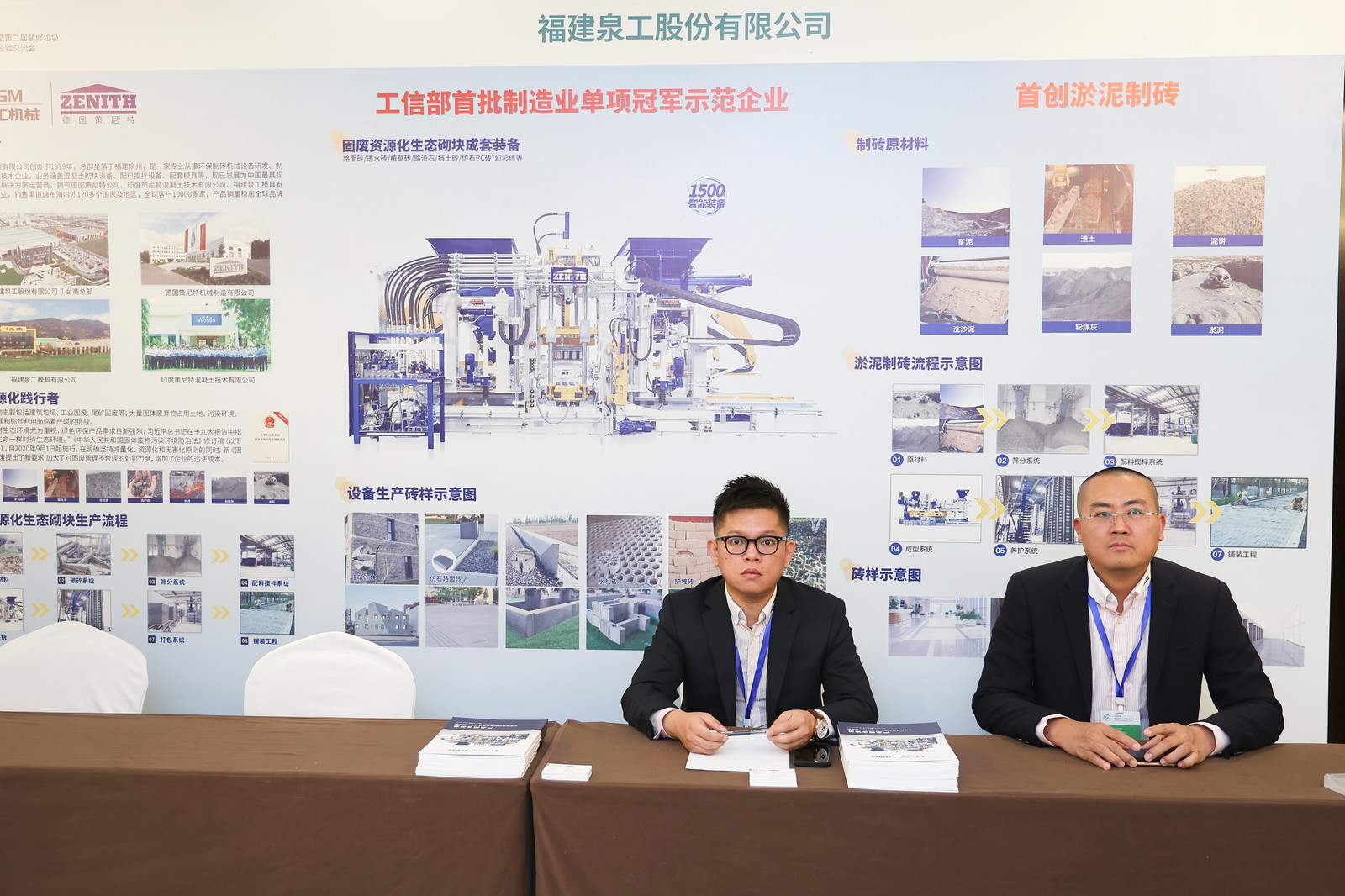 福建泉工股份有限公司(以下簡稱“泉工股份”)應邀出席,泉工股份副總經理傅國華發表了《綠色智能固廢制磚關鍵技術》的主旨報告。報告中指出泉工股份從通過干法振壓成型或濕法制磚工藝,為客戶提供定制化制磚解決方案,增加產品附加值,綜合利用固廢等原材料,全自動智能化生產:透水磚、路緣石、仿石PC磚、砌塊等各類制品。廣泛運用于市政廣場、園林景觀及水利、公路等工程,既解決了固廢的循環應用,同時為企業創造了良好的經濟效益,尤其是針對性處理超細粉物料,可大摻量消耗泥餅、渣土等粉狀材料,起到固廢資源綜合二次利用的效果。