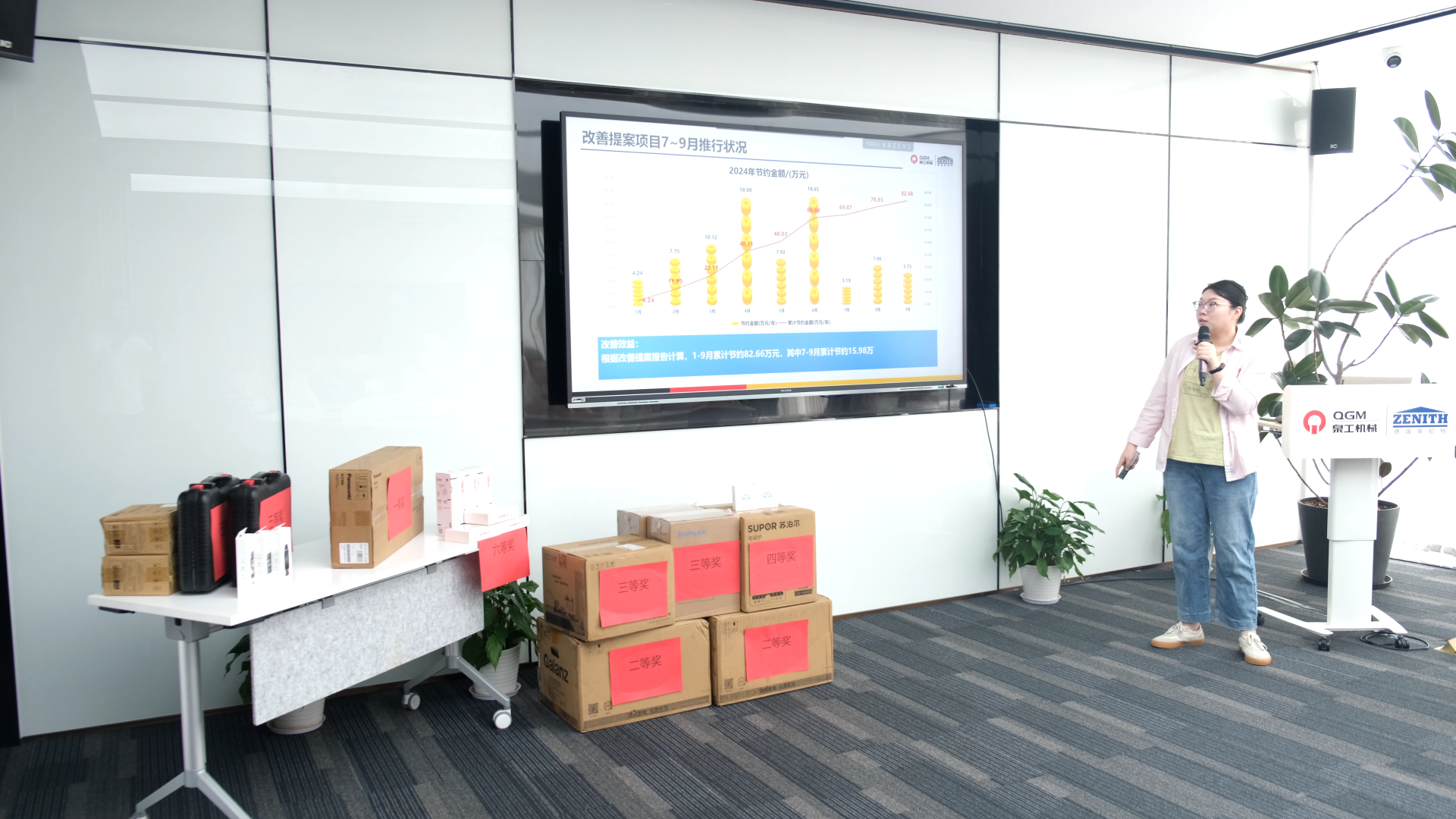 首先,由精益辦專員楊媚對7-9月改善提案進行了詳細的匯報。據統計,7-9月大多數提案等級分布在5-6級、參與級較多,累計節約15.98萬元,截止到目前,2024改善提案已累計節約82.66萬元。她表示,這些都離不開全體員工的努力,也希望大家之后在持續降本方針的指導下,踴躍參與,為公司降本增效和良性發展做出貢獻。